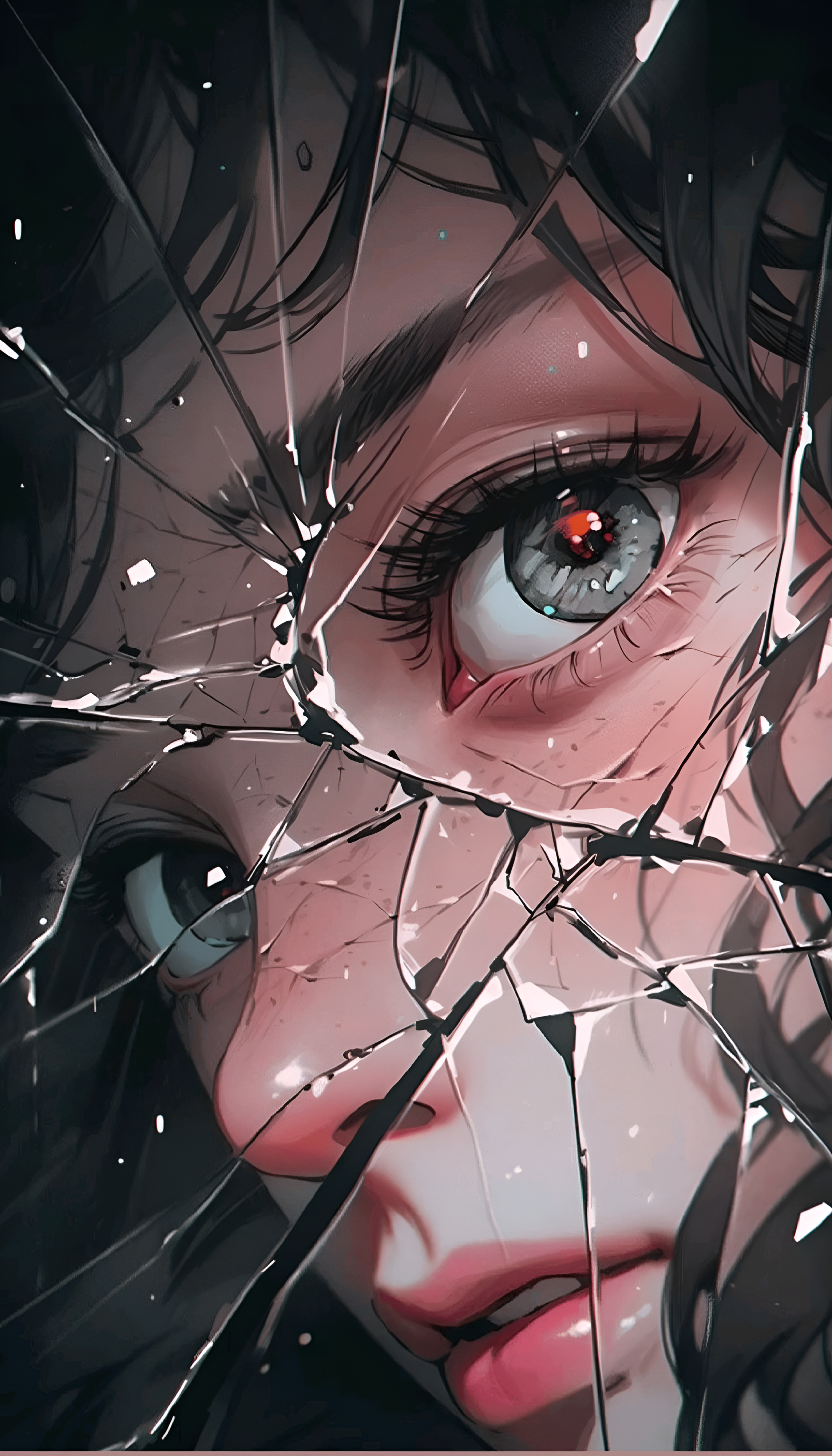 Immerse yourself in the haunting beauty of this captivating wallpaper featuring a close-up of a girl whose striking gaze pierces through the cracks of shattered glass. The intricate details of her expressive eyes and delicate features are beautifully contrasted against the fragmented reflections, creating a sense of depth and emotion. The ethereal color palette, combining soft skin tones with the starkness of the broken mirror, evokes a feeling of vulnerability and strength. Perfect for fans of artistic and emotional imagery, this wallpaper adds a unique touch to your digital devices, making it ideal for desktops, tablets, and smartphones.