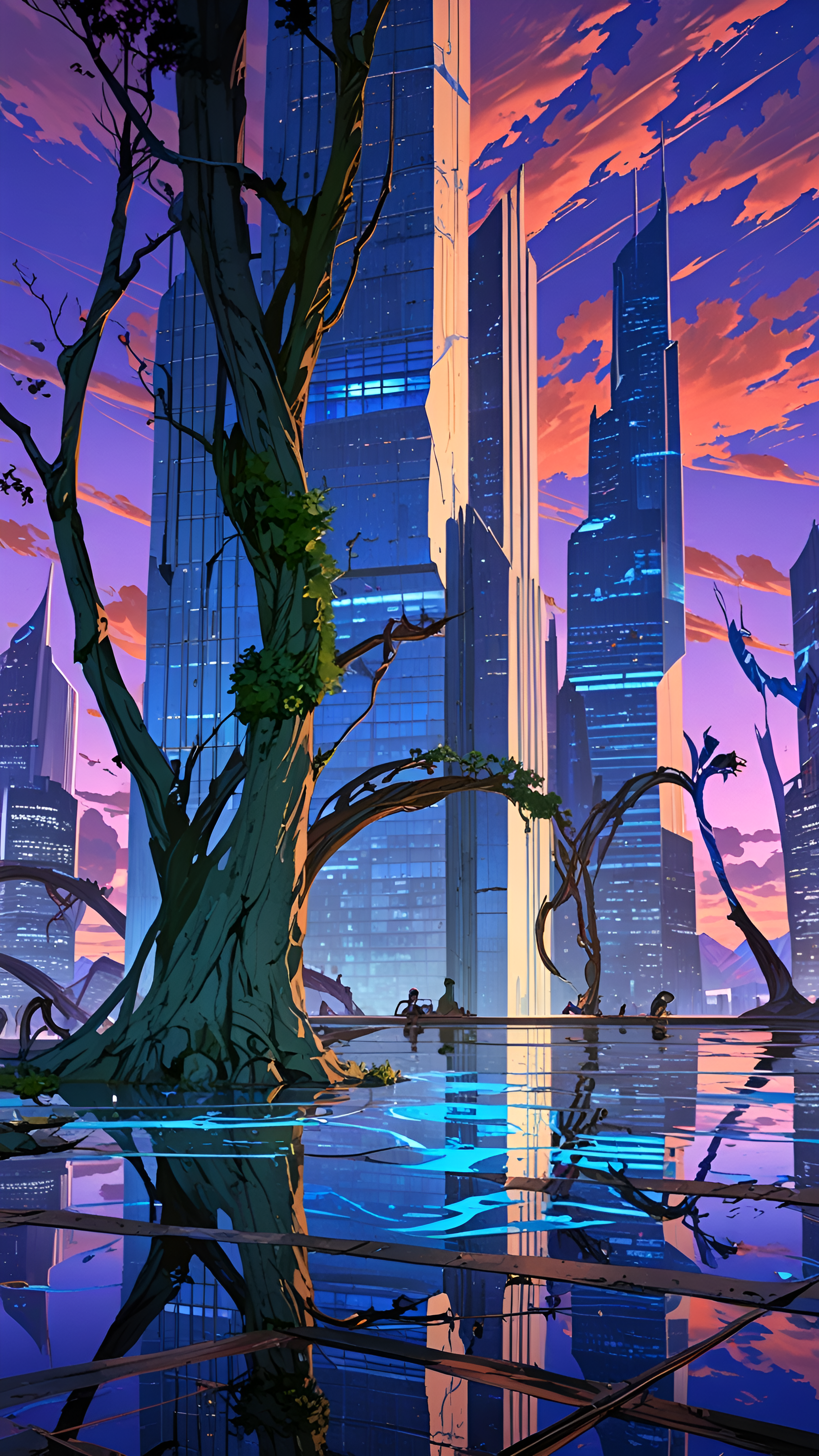 Explore a stunning futuristic cityscape with this captivating wallpaper that showcases towering skyscrapers set against a vibrant sunset sky. The dramatic colors of orange, purple, and blue blend seamlessly, creating an enchanting atmosphere. The intricate details of the buildings reflect beautifully in the calm waters below, enhancing the overall visual impact. Lush trees and twisting vines intertwine with the urban environment, symbolizing the harmony between nature and technology. Ideal for fans of sci-fi and urban art, this wallpaper adds a touch of imagination and sophistication to your digital devices, making it perfect for desktops, tablets, or smartphones.