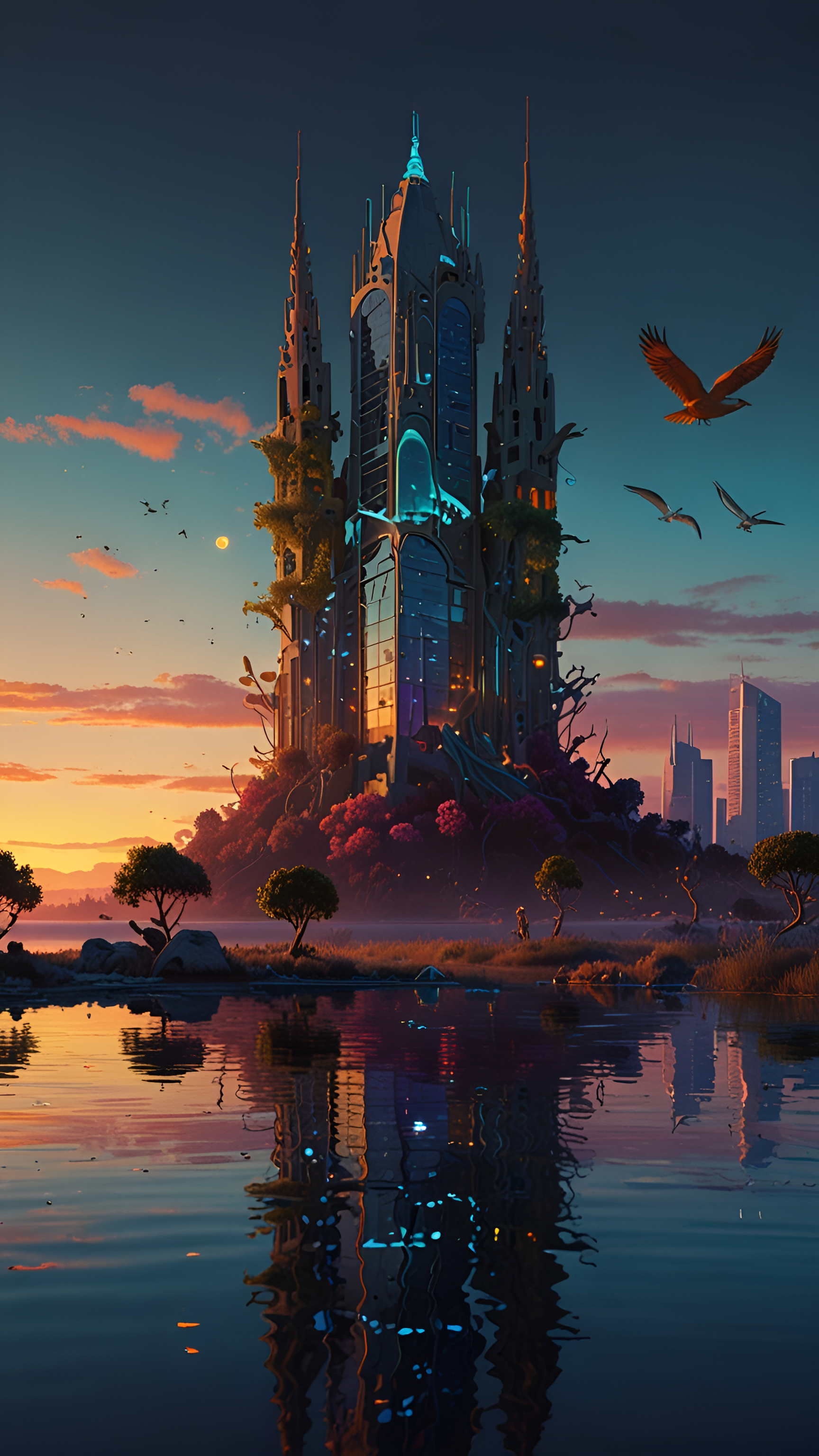 Immerse yourself in a captivating blend of nature and technology with this stunning wallpaper featuring a majestic futuristic tower set against a vibrant sunset. The tower, adorned with intricate designs and glowing accents, rises majestically from a lush landscape, surrounded by colorful flora. As the sun sets, the sky is painted in hues of orange, pink, and blue, reflecting beautifully in the tranquil waters below. Birds soar gracefully above, adding life to this serene scene. Perfect for fans of sci-fi and nature art, this wallpaper offers a glimpse into a harmonious future where technology and the environment coexist. Ideal for desktops, tablets, or smartphones, it brings a sense of wonder and inspiration to your digital devices.