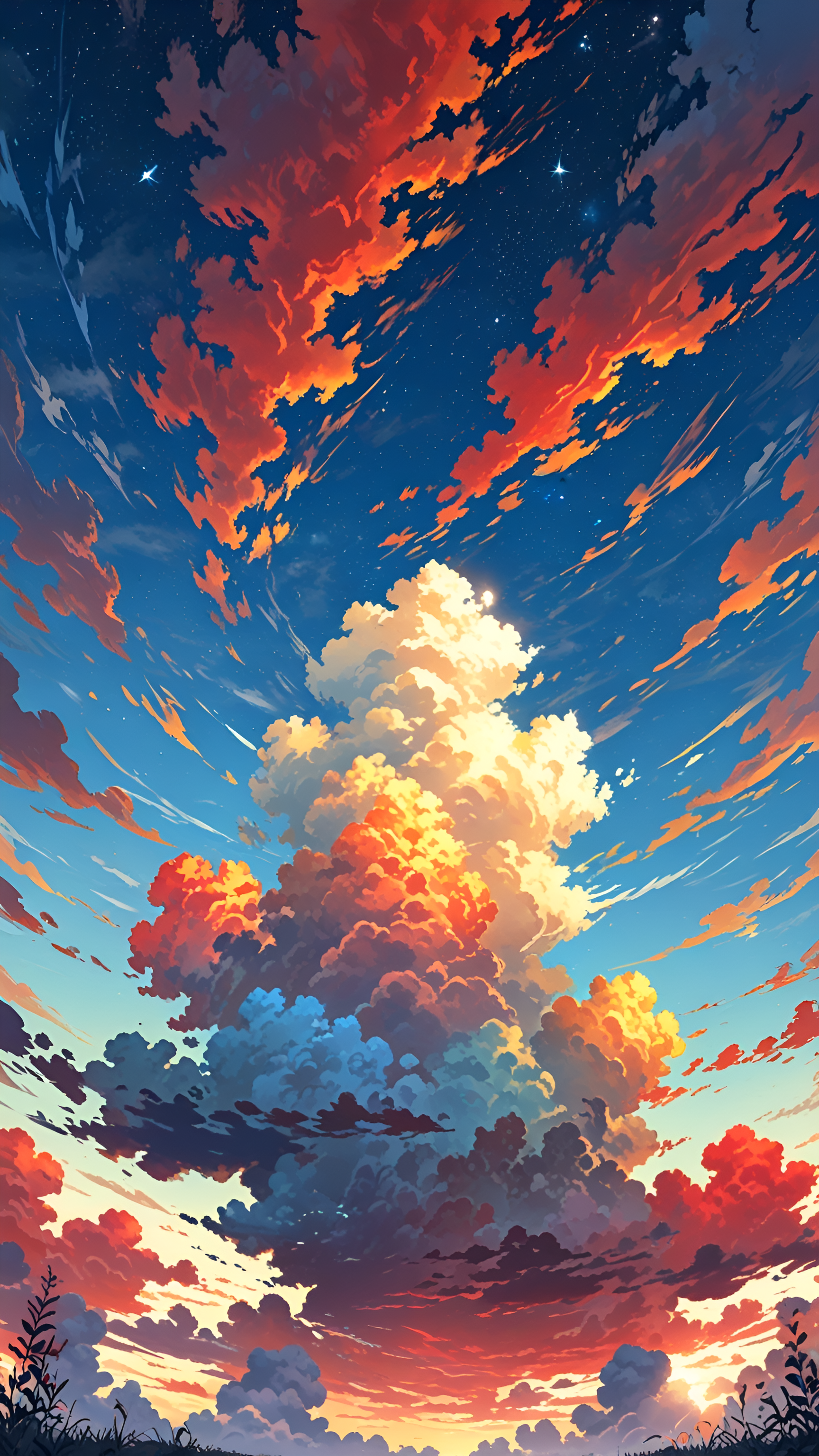 Experience the breathtaking beauty of nature with this stunning wallpaper showcasing a dramatic sunset sky filled with vibrant clouds in hues of orange, pink, and blue. The intricate details of the clouds, illuminated by the setting sun, create a mesmerizing scene that evokes a sense of wonder and tranquility. As the stars begin to twinkle in the deepening blue sky, this wallpaper captures the serene transition from day to night. Perfect for nature lovers and those seeking inspiration, this captivating image adds a touch of elegance and warmth to your digital devices, making it ideal for desktops, tablets, or smartphones.
