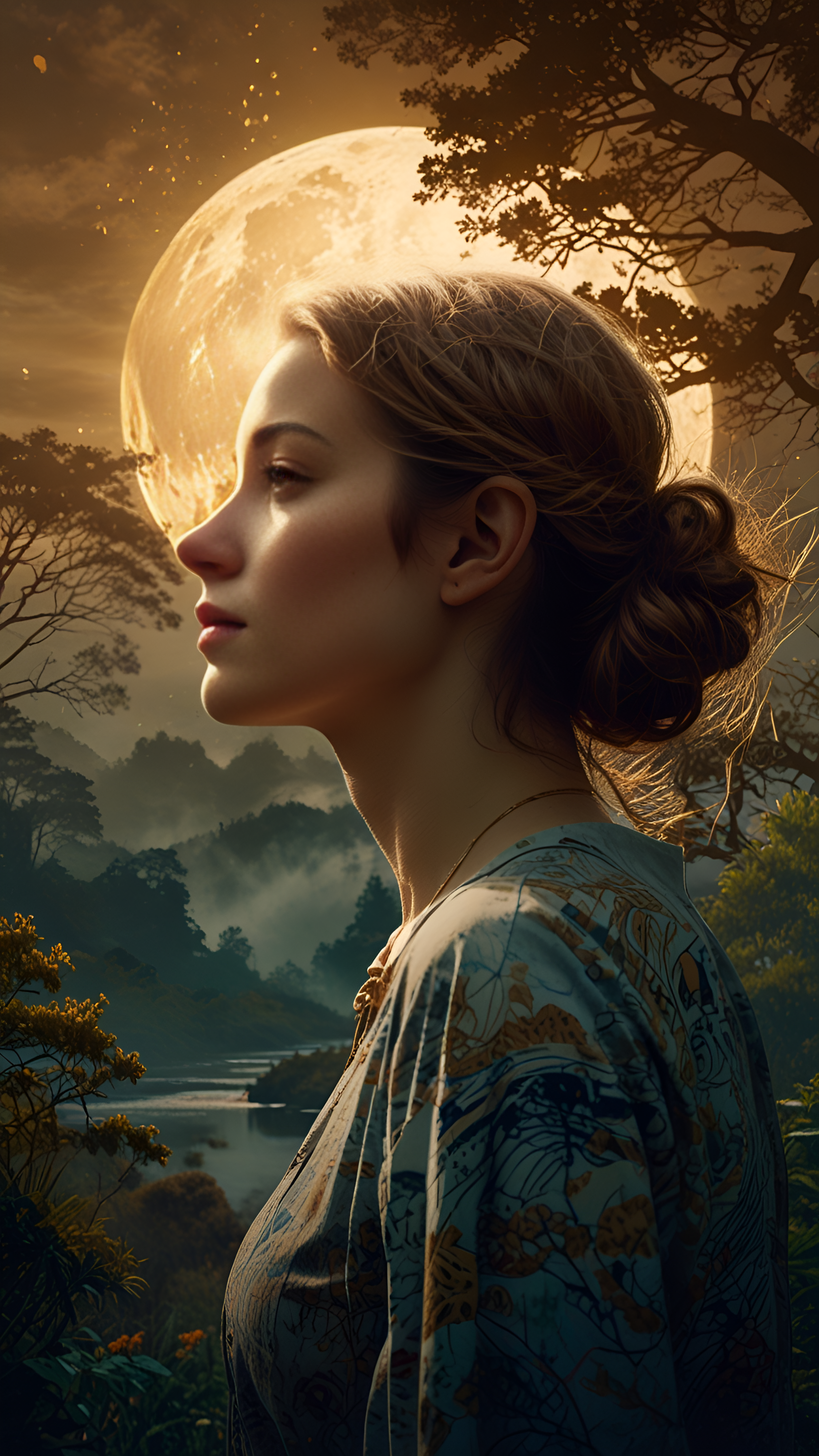 Immerse yourself in the enchanting beauty of this captivating wallpaper, featuring a silhouette of a figure set against a breathtaking full moon and a tranquil landscape. The soft glow of the moon illuminates the surrounding trees and water, creating a serene and mystical atmosphere. This artwork evokes a sense of peace and introspection, making it perfect for anyone looking to add a touch of magic to their digital devices. Ideal for nature lovers, dreamers, and those who appreciate the beauty of the night sky, this wallpaper invites you to pause and reflect.