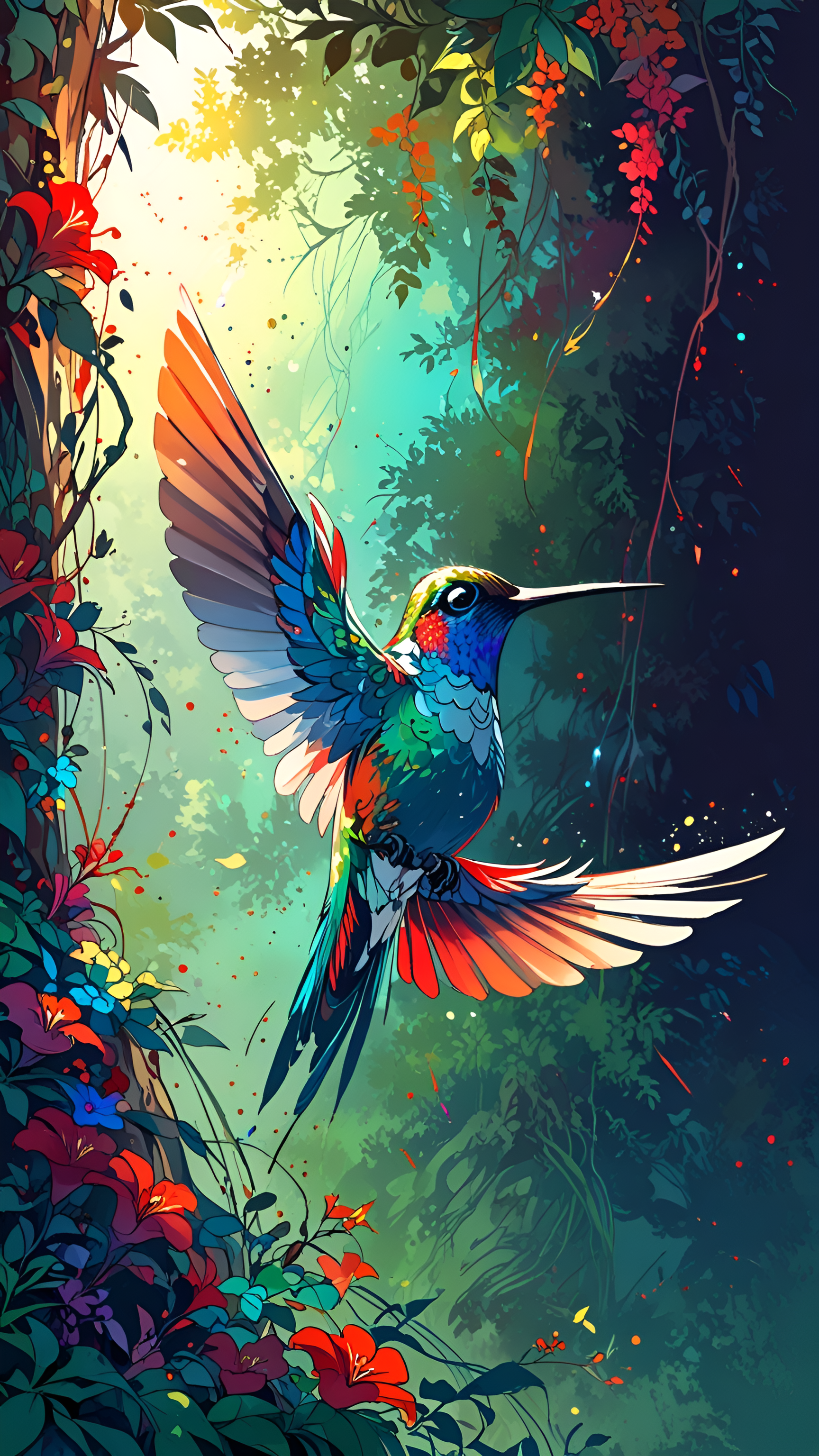 Immerse yourself in the beauty of nature with this vibrant wallpaper featuring a stunning hummingbird in mid-flight, surrounded by a lush tropical paradise. The intricate details of the bird's colorful plumage contrast beautifully with the rich greens and vivid red and blue flowers in the background. This lively scene captures the essence of a thriving ecosystem, making it perfect for nature lovers and those who appreciate the beauty of wildlife. Ideal for desktops, tablets, and smartphones, this wallpaper brings a splash of color and life to your digital space, inspiring joy and tranquility every time you glance at it.