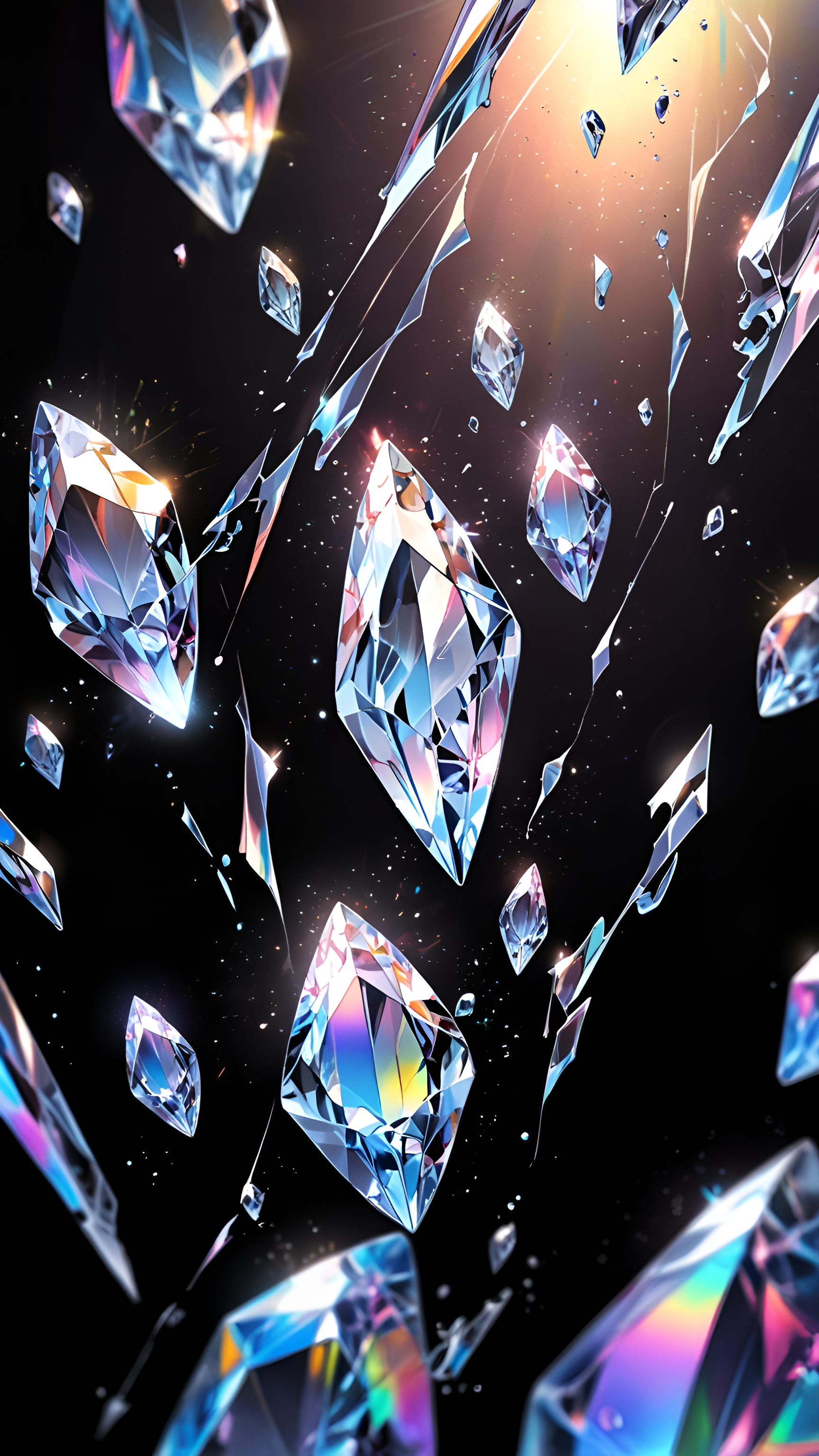 Discover the captivating beauty of this stunning wallpaper showcasing a dazzling array of shattered diamonds suspended in a cosmic space. Each diamond reflects a spectrum of colors, creating a mesmerizing visual display against a deep black backdrop. The interplay of light and shadow adds depth and intrigue, making this wallpaper perfect for those who appreciate luxury and elegance. Ideal for enhancing your desktop, tablet, or smartphone, this artwork transforms any digital space into a realm of sophistication and beauty. Embrace the brilliance of these floating gems and let them inspire your creativity.