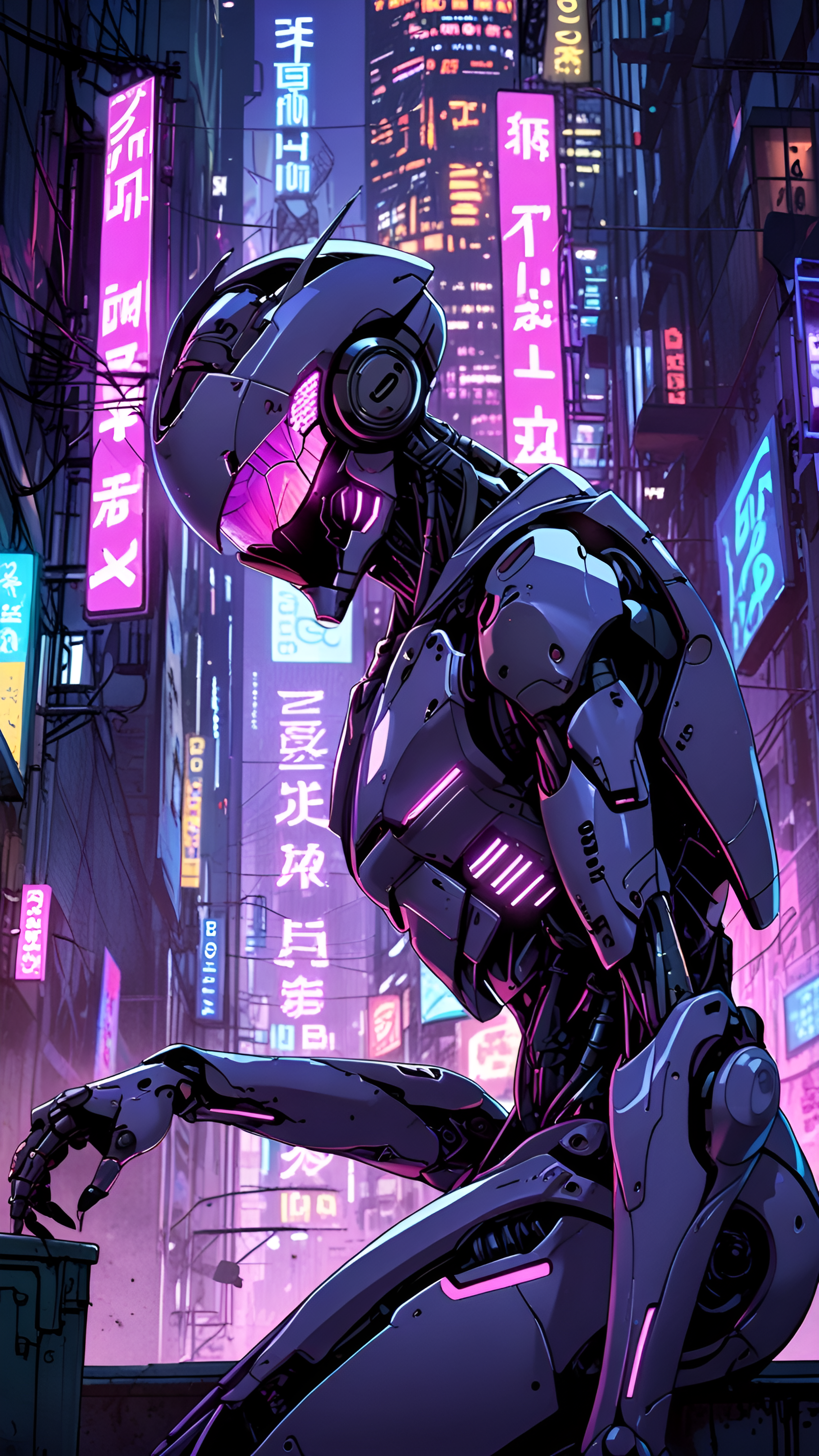 Striking image of a sleek robotic figure set against a vibrant cyberpunk city backdrop. Ideal for sci-fi enthusiasts and futuristic aesthetic lovers.