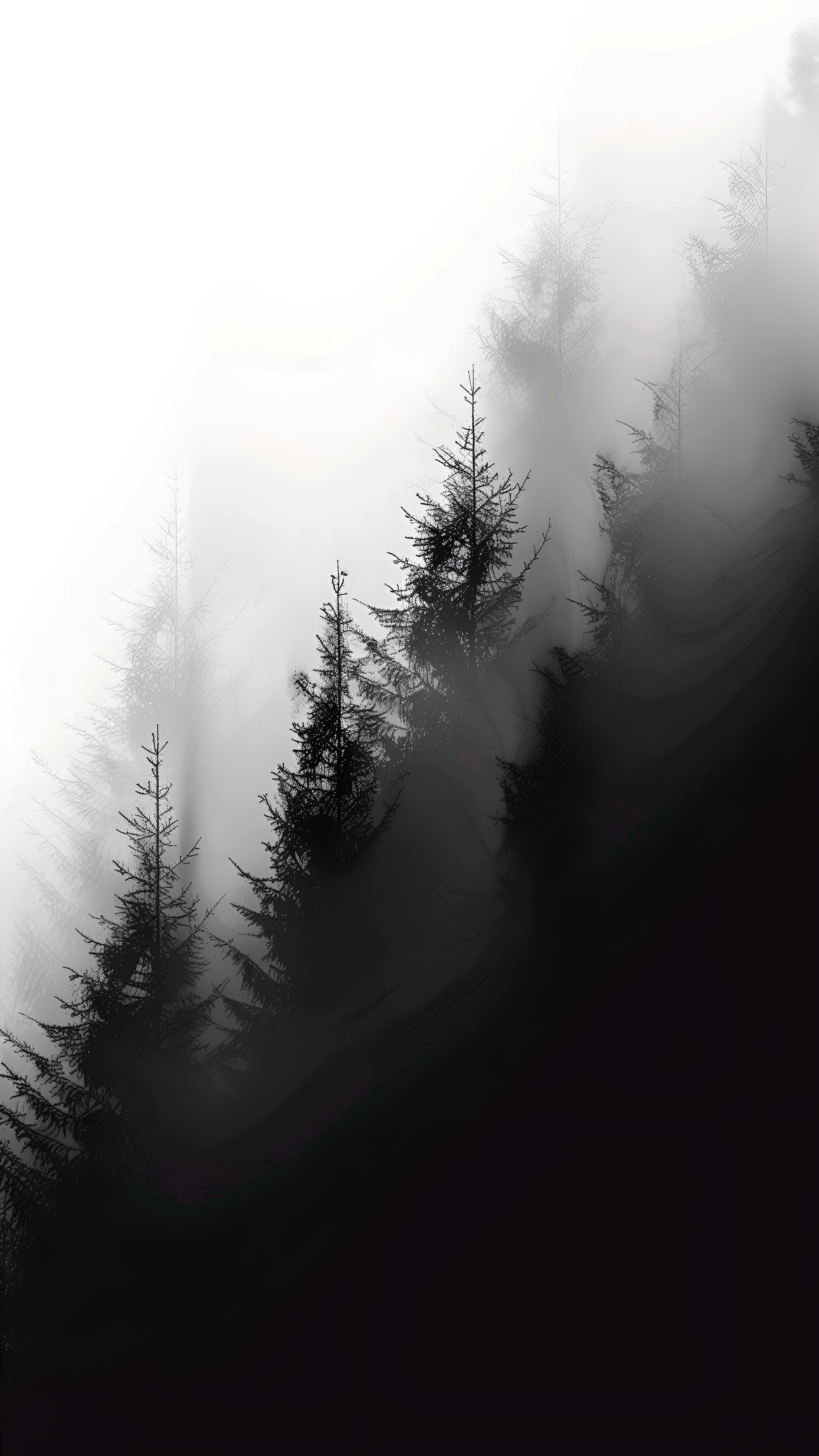 Atmospheric black and white wallpaper featuring pine trees shrouded in mist. Perfect for nature lovers and those seeking a moody, minimalist aesthetic.
