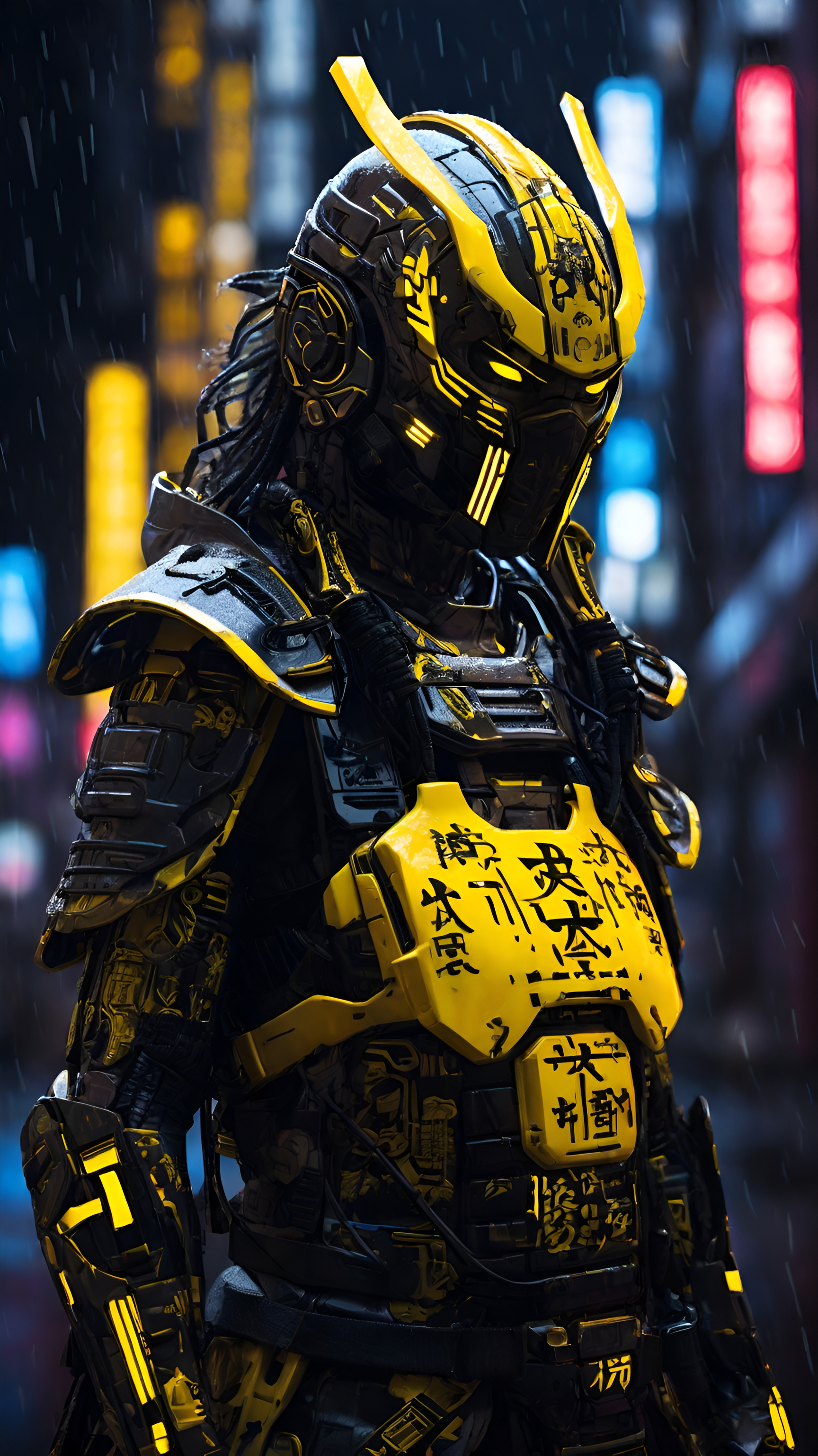 Futuristic samurai with glowing yellow armor stands in a rainy, neon-lit city. Perfect cyberpunk phone wallpaper for sci-fi and anime fans.