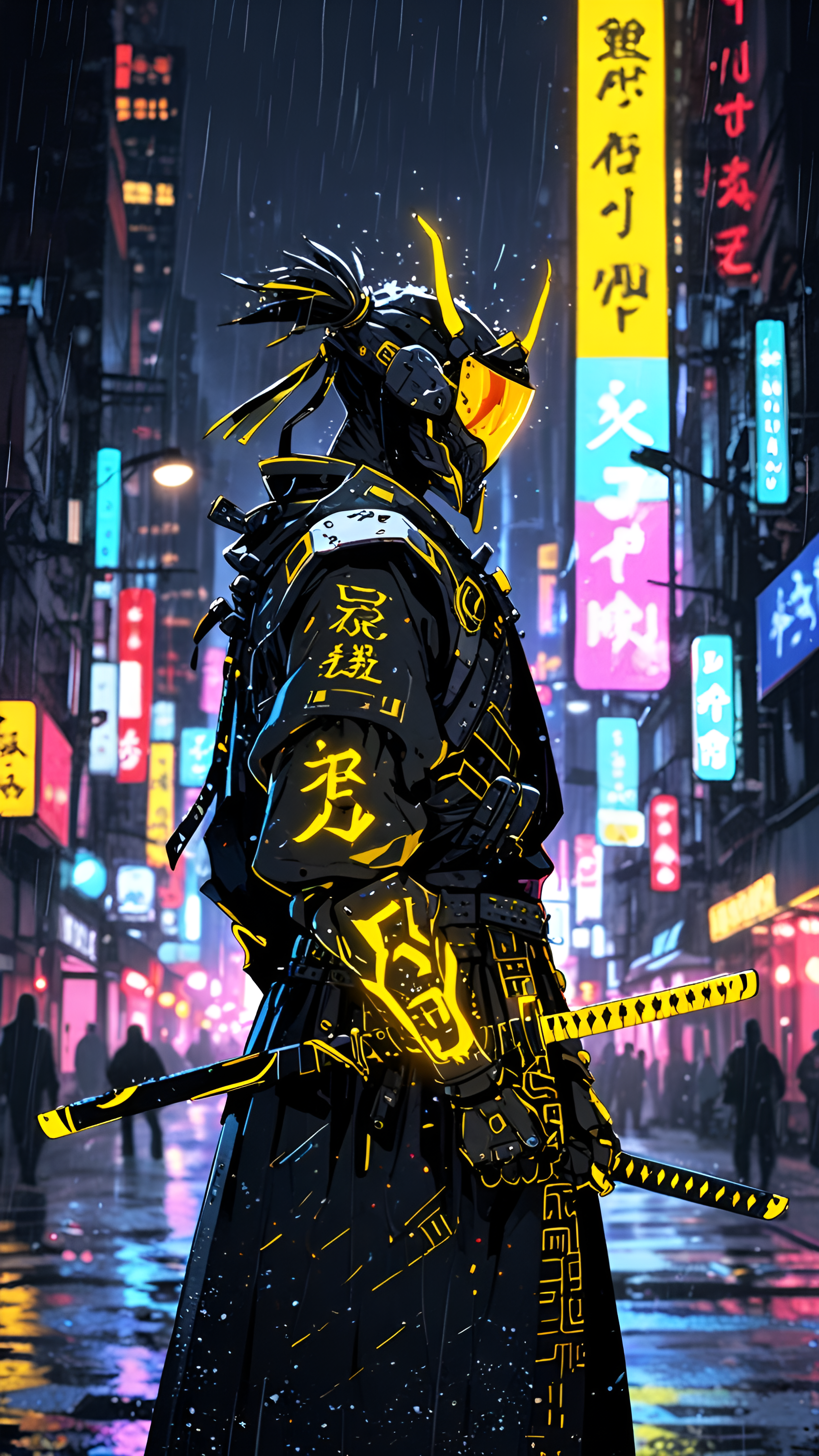 Futuristic samurai in glowing armor stands amid a rainy, neon-drenched cityscape. Perfect blend of ancient and cyberpunk aesthetics for phone backgrounds.