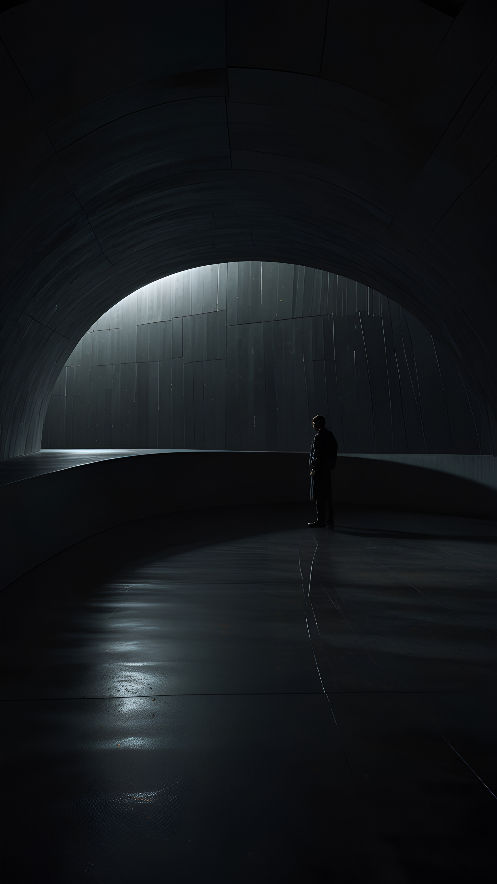 Immerse yourself in the captivating atmosphere of this wallpaper showcasing a silhouette of a person standing in a sleek, futuristic tunnel. The interplay of light and shadow creates a dramatic effect, highlighting the innovative architectural design of the space. With smooth lines and a reflective floor, this image evokes a sense of solitude and contemplation, perfect for fans of modern aesthetics and sci-fi themes. Ideal for those seeking an inspiring backdrop that sparks imagination and curiosity about the future, this wallpaper transforms any digital environment into a serene escape.