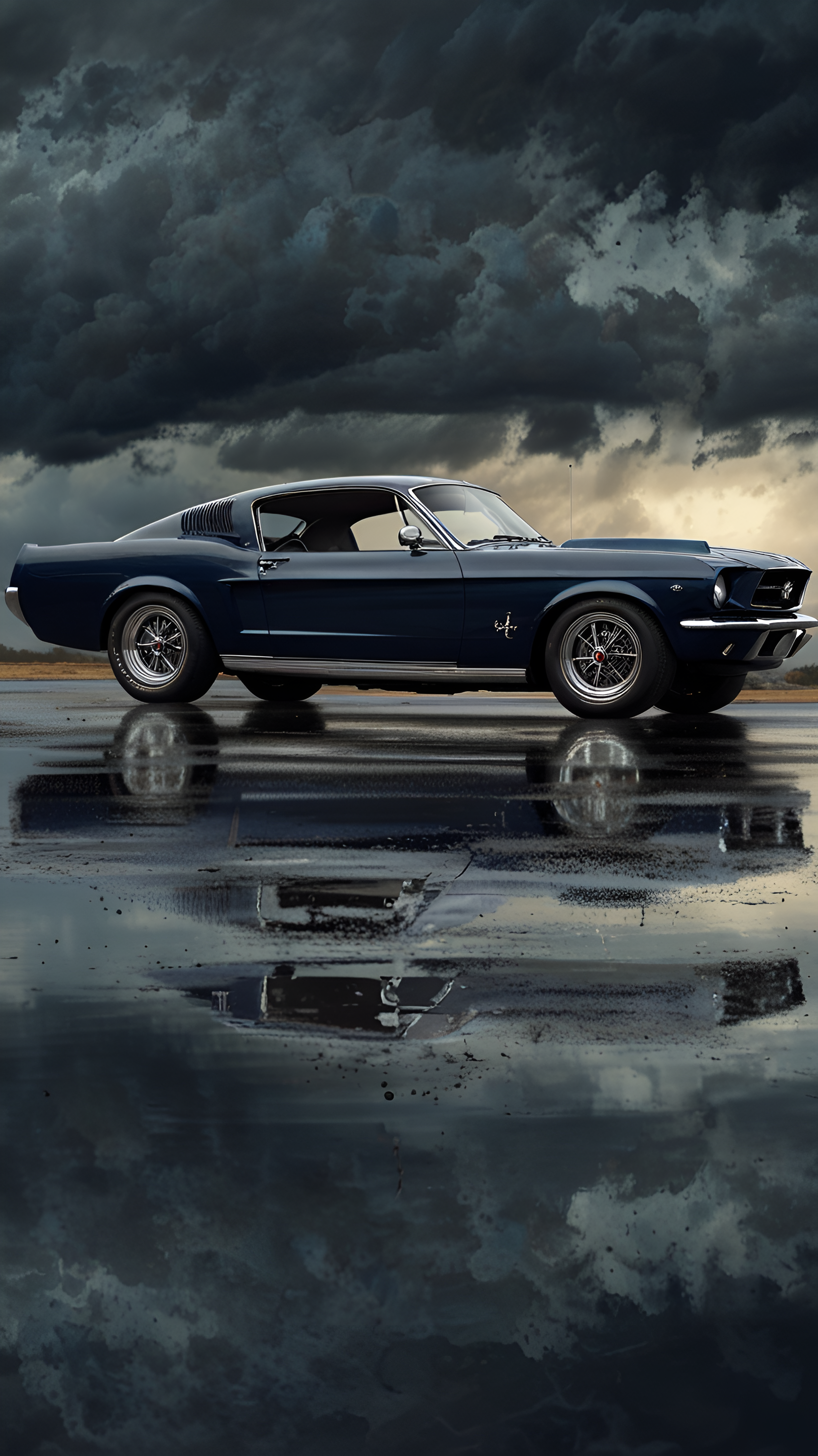 Experience the timeless allure of automotive excellence with this stunning wallpaper featuring a classic blue Mustang convertible. Set against a backdrop of dramatic, stormy skies, the sleek lines and polished finish of the car are beautifully reflected on the wet surface below. This image captures the essence of freedom and adventure, making it an ideal choice for car enthusiasts and classic vehicle lovers. Perfect for adding a touch of nostalgia and style to your digital devices, this wallpaper showcases the perfect blend of power and elegance.