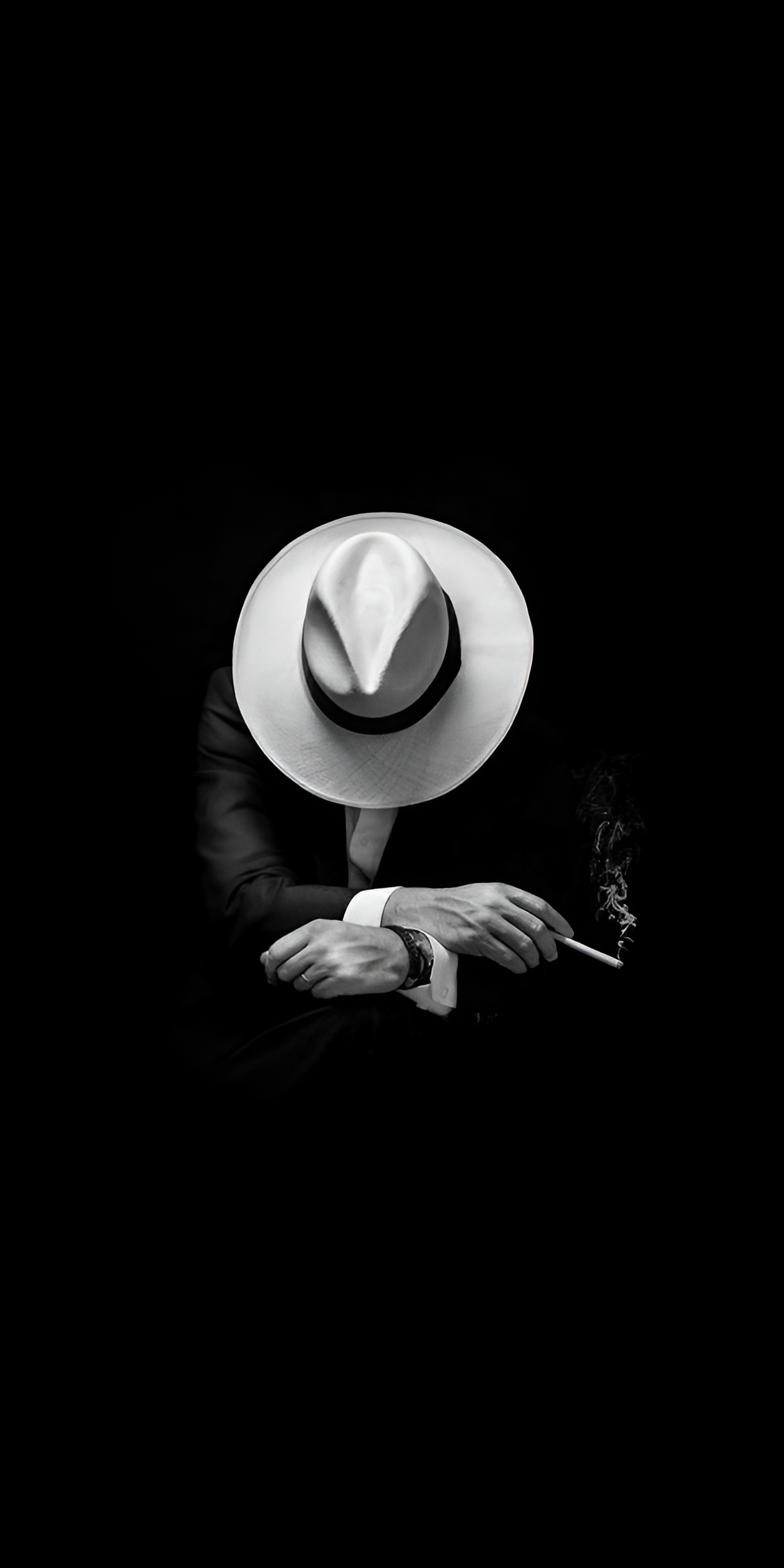 Step into the world of classic elegance with this captivating wallpaper featuring a stylish man in a suit, adorned with a white hat, and holding a cigarette. Set against a stark black background, the image exudes a timeless noir aesthetic, capturing the essence of sophistication and mystery. The contrast between the man's attire and the dark backdrop creates a striking visual, perfect for those who appreciate vintage style and cinematic flair. This wallpaper is ideal for adding a touch of class and intrigue to any digital device, making it a must-have for fashion aficionados and lovers of classic cinema.