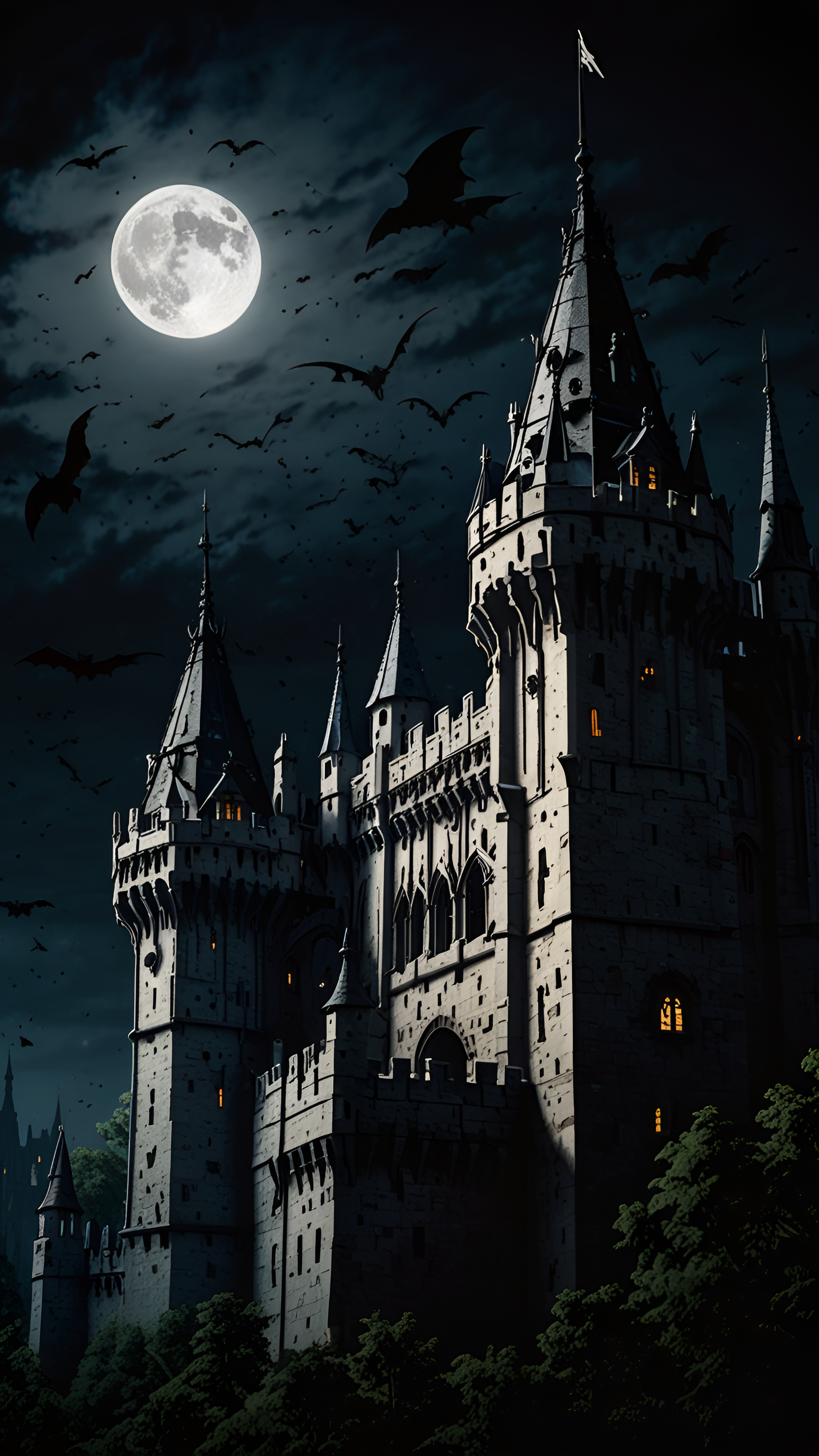 Step into a world of mystery and intrigue with this captivating wallpaper featuring a gothic castle illuminated by the light of a full moon. The eerie atmosphere is enhanced by the silhouette of bats soaring through the night sky, creating a haunting yet beautiful scene. The castle's intricate architecture stands tall against the dark backdrop, with warm lights glowing from the windows, inviting curiosity. Perfect for fans of fantasy and gothic art, this high-resolution wallpaper adds a touch of drama and enchantment to your digital devices, making it an ideal choice for Halloween or any time you wish to evoke a sense of wonder.