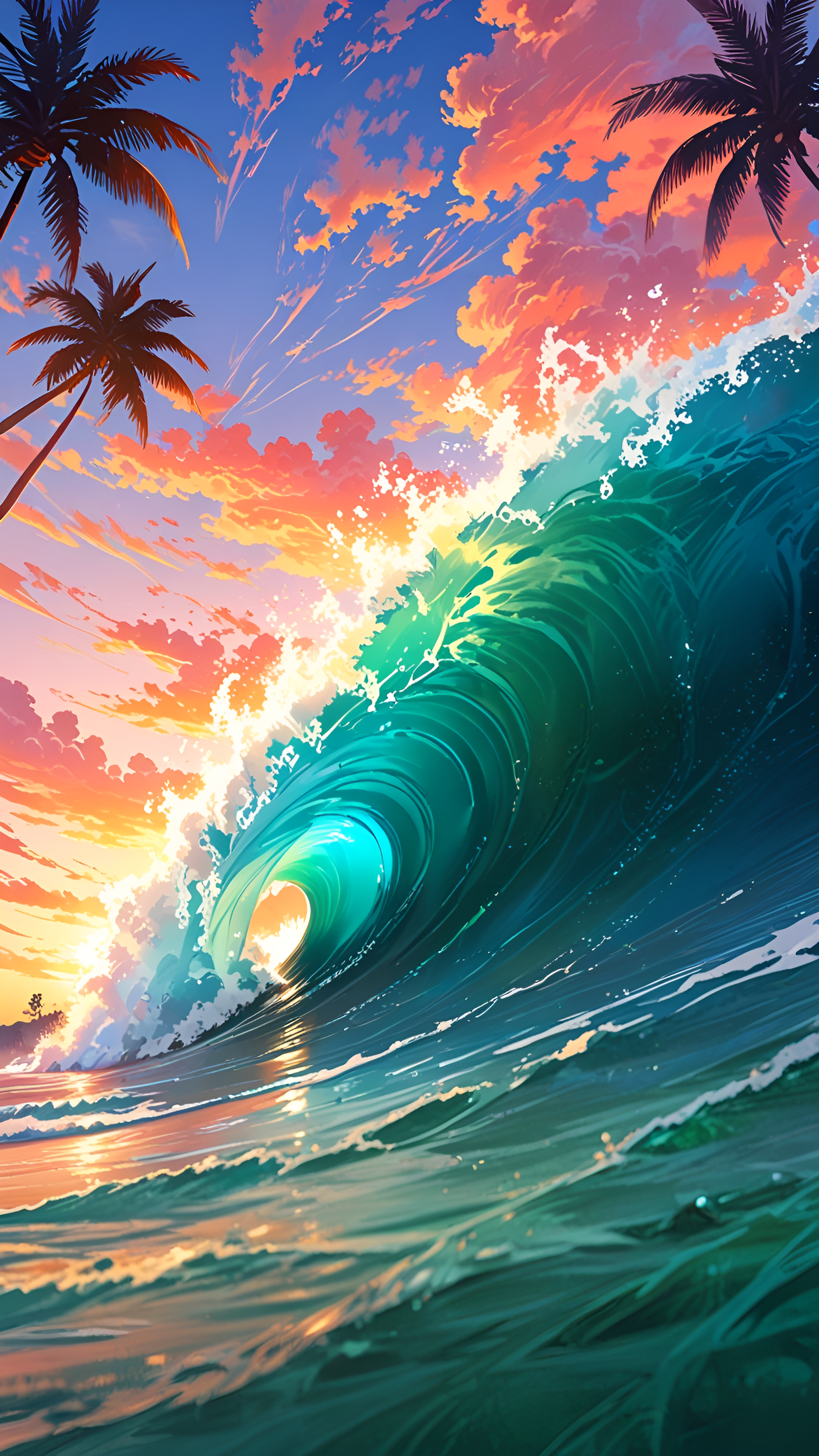 Experience the breathtaking beauty of nature with this stunning wallpaper showcasing a majestic wave crashing against a vibrant sunset. The rich hues of turquoise and emerald green in the wave contrast beautifully with the warm oranges, pinks, and purples of the sky, creating a mesmerizing visual spectacle. Silhouetted palm trees frame the scene, enhancing the tropical feel and inviting viewers to escape to a serene paradise. Perfect for ocean lovers, beach enthusiasts, and those who appreciate the beauty of nature, this digital wallpaper will bring a sense of tranquility and adventure to your desktop or mobile device.