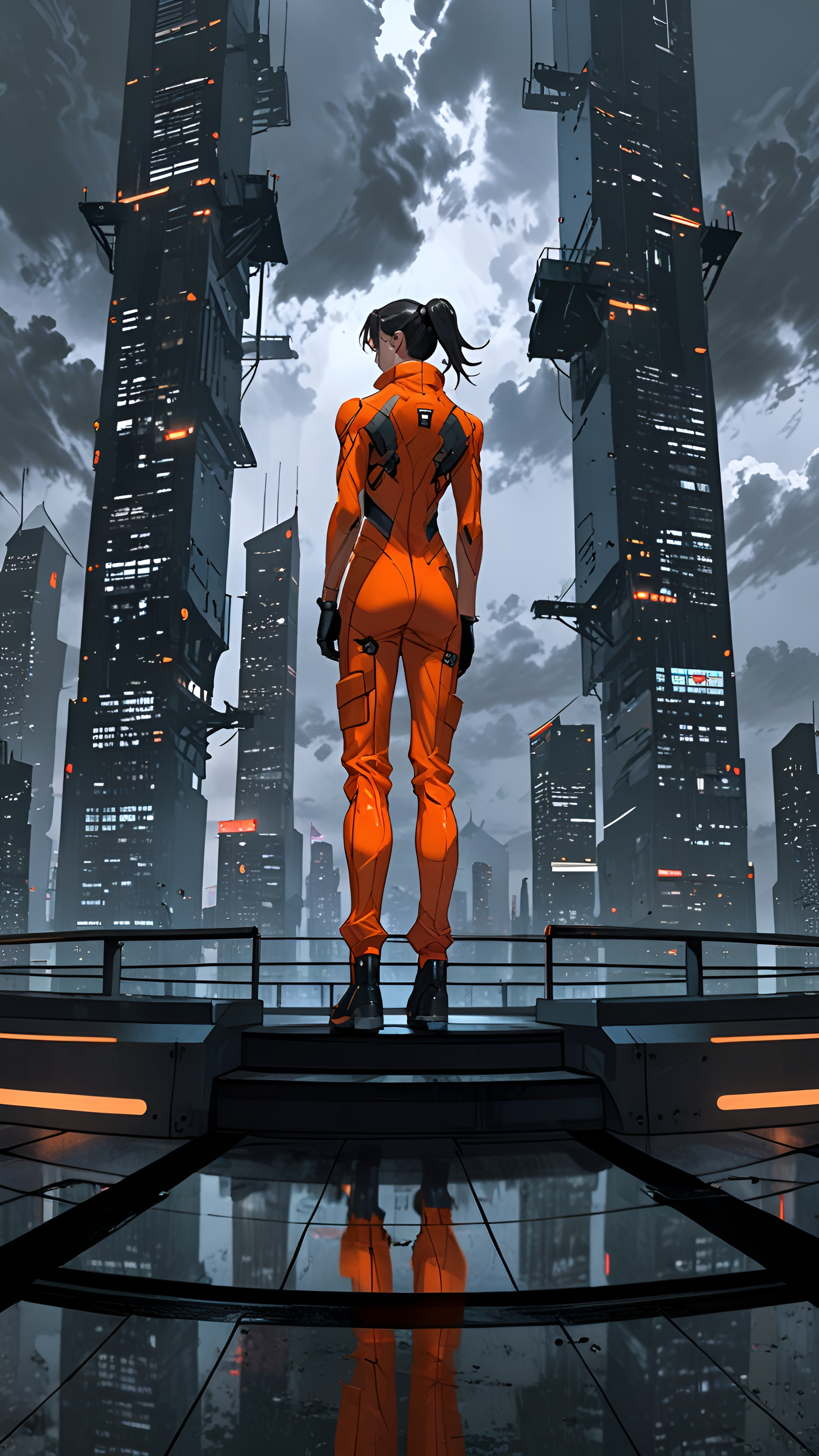 Immerse yourself in a stunning digital landscape featuring a futuristic character clad in a striking orange suit, poised against a backdrop of towering neon-lit skyscrapers. The dramatic contrast between the dark, moody sky and the vibrant orange of the suit creates a captivating visual experience. This artwork embodies the essence of a cyberpunk world, filled with advanced technology and urban exploration. Perfect for fans of sci-fi, gaming, and digital art, this wallpaper will inspire your imagination and add a touch of futuristic flair to your desktop or mobile device.