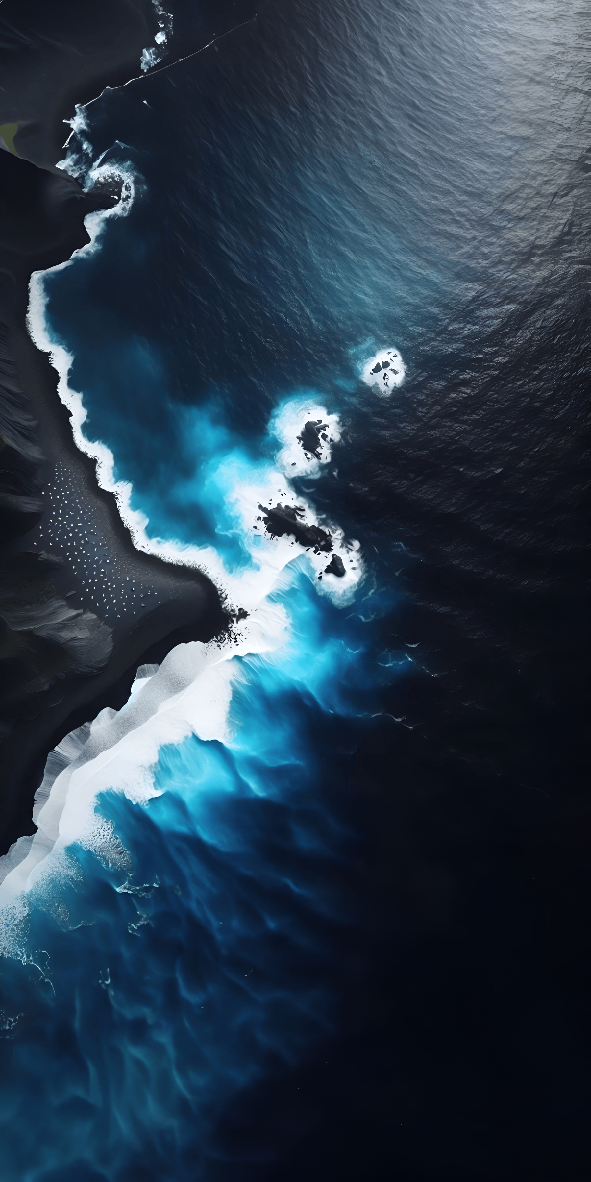 Immerse yourself in the stunning beauty of nature with this breathtaking aerial view of a rugged coastline where vibrant blue waves crash against dark volcanic rocks. The contrast between the deep blue ocean and the stark black shoreline creates a dramatic and captivating scene, showcasing the raw power and beauty of the sea. This artwork captures the essence of coastal landscapes, inviting viewers to appreciate the intricate details of the waves and the textures of the rocks. Perfect for nature enthusiasts and those who love ocean photography, this digital wallpaper will bring a sense of adventure and tranquility to any desktop or mobile device.