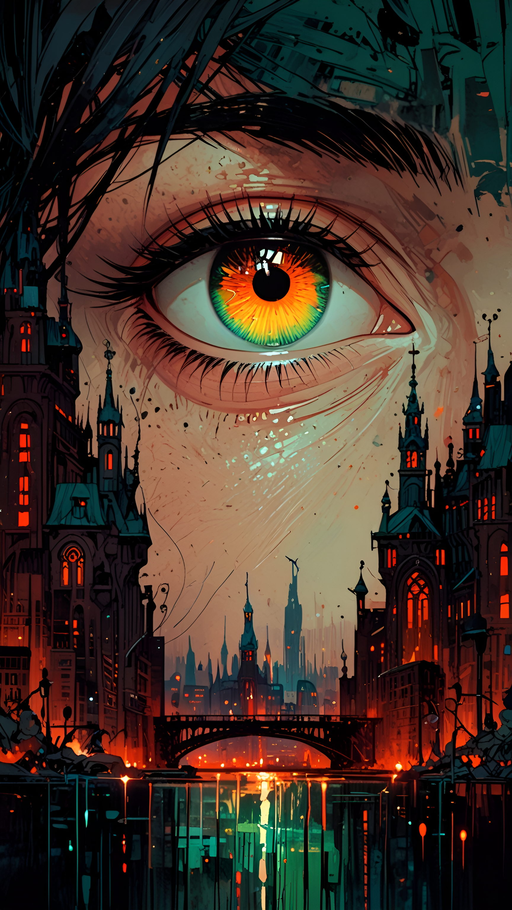 Explore the depths of imagination with this striking wallpaper that features a surreal urban landscape dominated by a mesmerizing eye. The vibrant orange and green hues of the eye contrast beautifully with the dark, intricate architecture of the city, illuminated by glowing lights. This artwork captures the essence of a futuristic metropolis, where the eye symbolizes perception and insight amidst the chaos of urban life. Perfect for fans of surrealism and urban art, this digital wallpaper will add a bold and thought-provoking touch to any desktop or mobile device, inviting viewers to ponder the mysteries of the city and beyond.