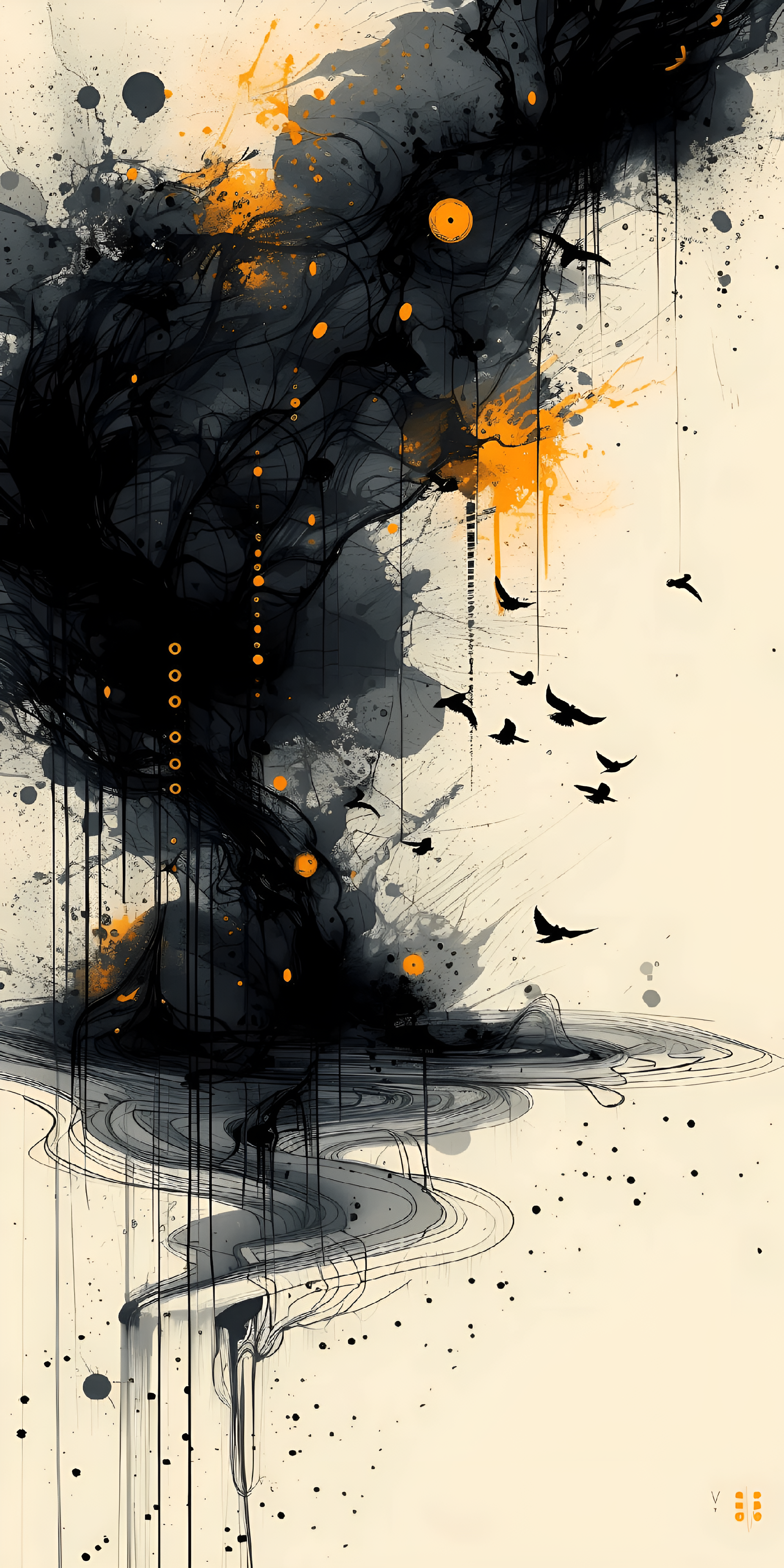 Delve into the depths of creativity with this striking abstract wallpaper that features a dynamic interplay of black and orange hues. The flowing lines and splashes of color create a sense of movement and energy, while silhouettes of birds soaring through the composition evoke feelings of freedom and exploration. This artwork's unique blend of chaos and serenity makes it perfect for those who appreciate modern art and abstract designs. Ideal for desktops and mobile devices, this wallpaper will add a contemporary touch to your digital space, inspiring viewers to embrace their artistic side and dream big.