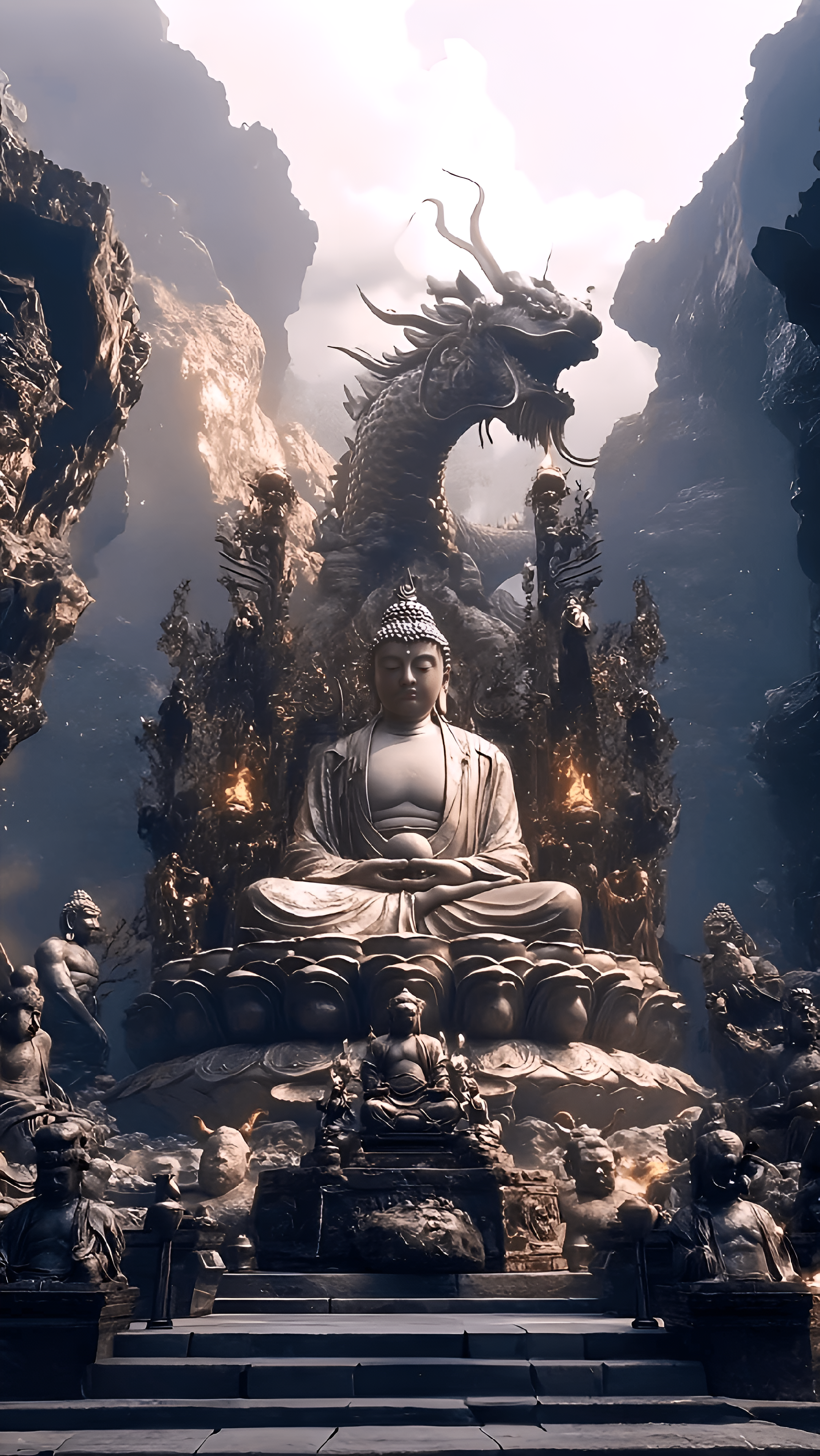 Explore the enchanting world of spirituality with this captivating wallpaper featuring a majestic Buddha statue seated serenely in a mystical cavern. Surrounded by intricate sculptures and a powerful dragon looming above, this artwork embodies the harmony of strength and tranquility. The ethereal lighting enhances the spiritual ambiance, creating a scene that invites contemplation and reflection. Perfect for those who appreciate spiritual and mythical themes, this digital wallpaper will bring a sense of peace and inspiration to any desktop or mobile device, making it an ideal choice for meditation spaces or personal retreats.