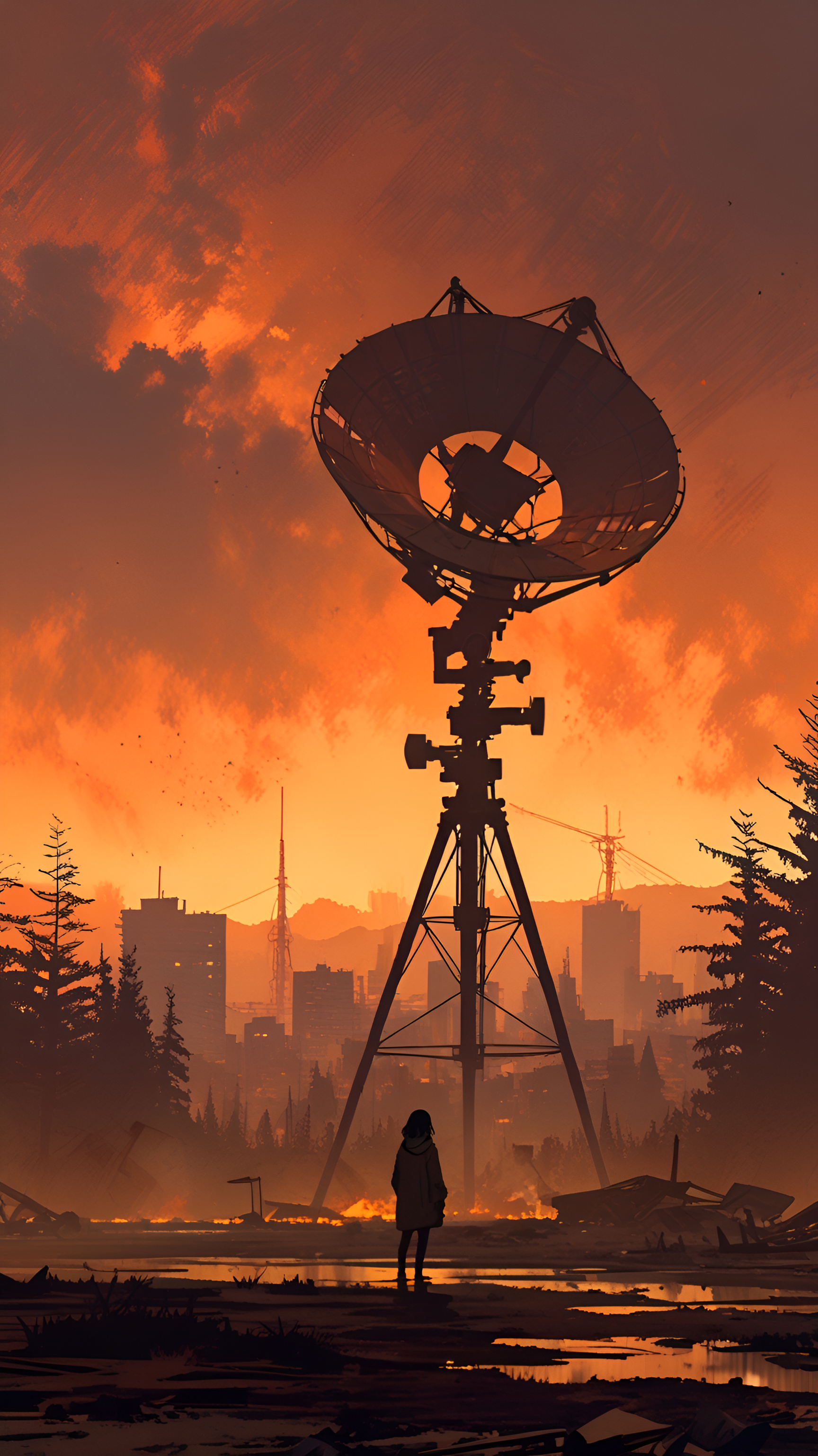 Experience the haunting beauty of a post-apocalyptic landscape with this striking wallpaper depicting a lone figure silhouetted against a massive satellite dish during a dramatic sunset. The fiery orange and deep shadows create an atmosphere of mystery and intrigue, inviting viewers to ponder the stories of a world left behind. Ideal for fans of dystopian themes and urban exploration, this artwork serves as a powerful reminder of nature's reclaiming of technology amidst the remnants of civilization. Perfect for adding a touch of drama and thought-provoking imagery to your desktop or mobile device.