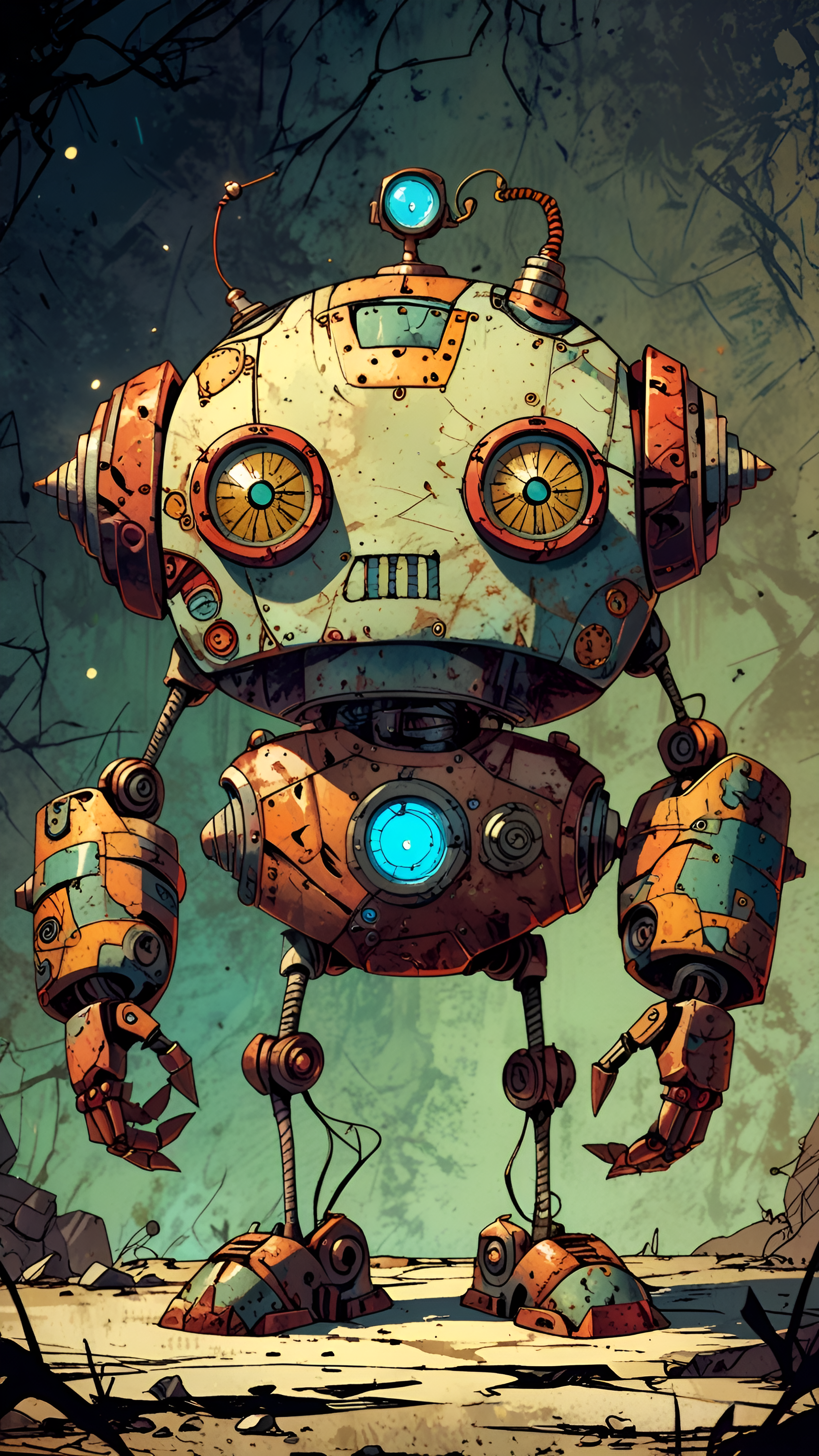 Discover the charm of retro-futurism with this captivating wallpaper showcasing a quirky vintage-style robot standing proudly in a rugged landscape. With its unique design and vibrant colors, this robot exudes personality and character, featuring a round body, expressive eyes, and an array of mechanical details that tell a story of a bygone era. The textured background enhances the overall aesthetic, making it perfect for fans of steampunk and retro sci-fi. Ideal for desktops and mobile devices, this wallpaper will add a touch of whimsy and creativity to your digital space, appealing to both robot enthusiasts and lovers of imaginative art.
