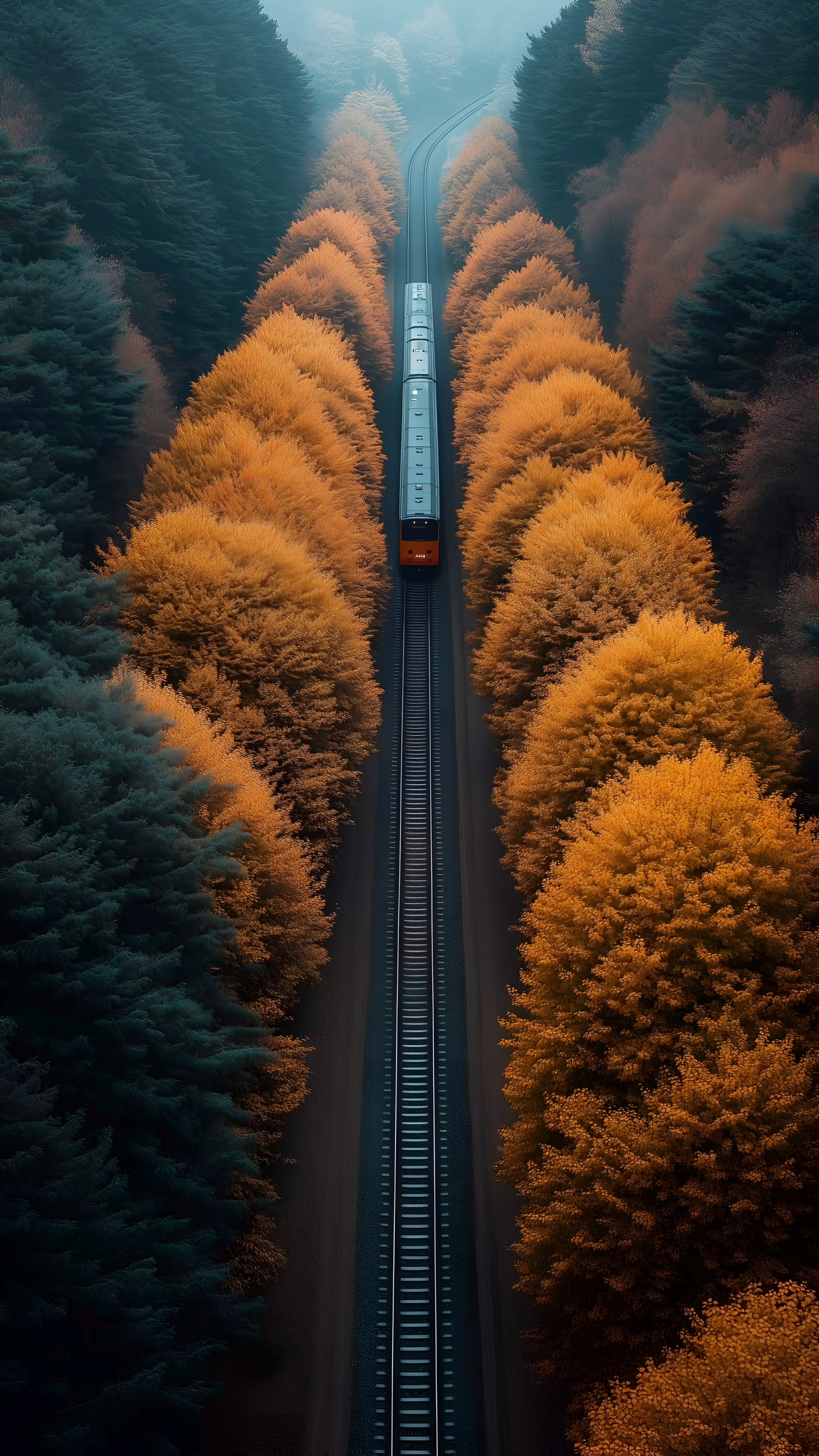 Embark on a visual journey with this stunning wallpaper depicting a train gracefully traveling through a vibrant autumn landscape. Flanked by rows of golden and orange trees, the scene captures the essence of fall with its rich hues and serene atmosphere. The misty backdrop adds a touch of mystery, enhancing the tranquil beauty of the railway winding through nature. Perfect for train enthusiasts and nature lovers alike, this wallpaper brings warmth and a sense of adventure to any digital device. Ideal for creating a cozy and inviting ambiance, this image is a celebration of the beauty of travel and the changing seasons.