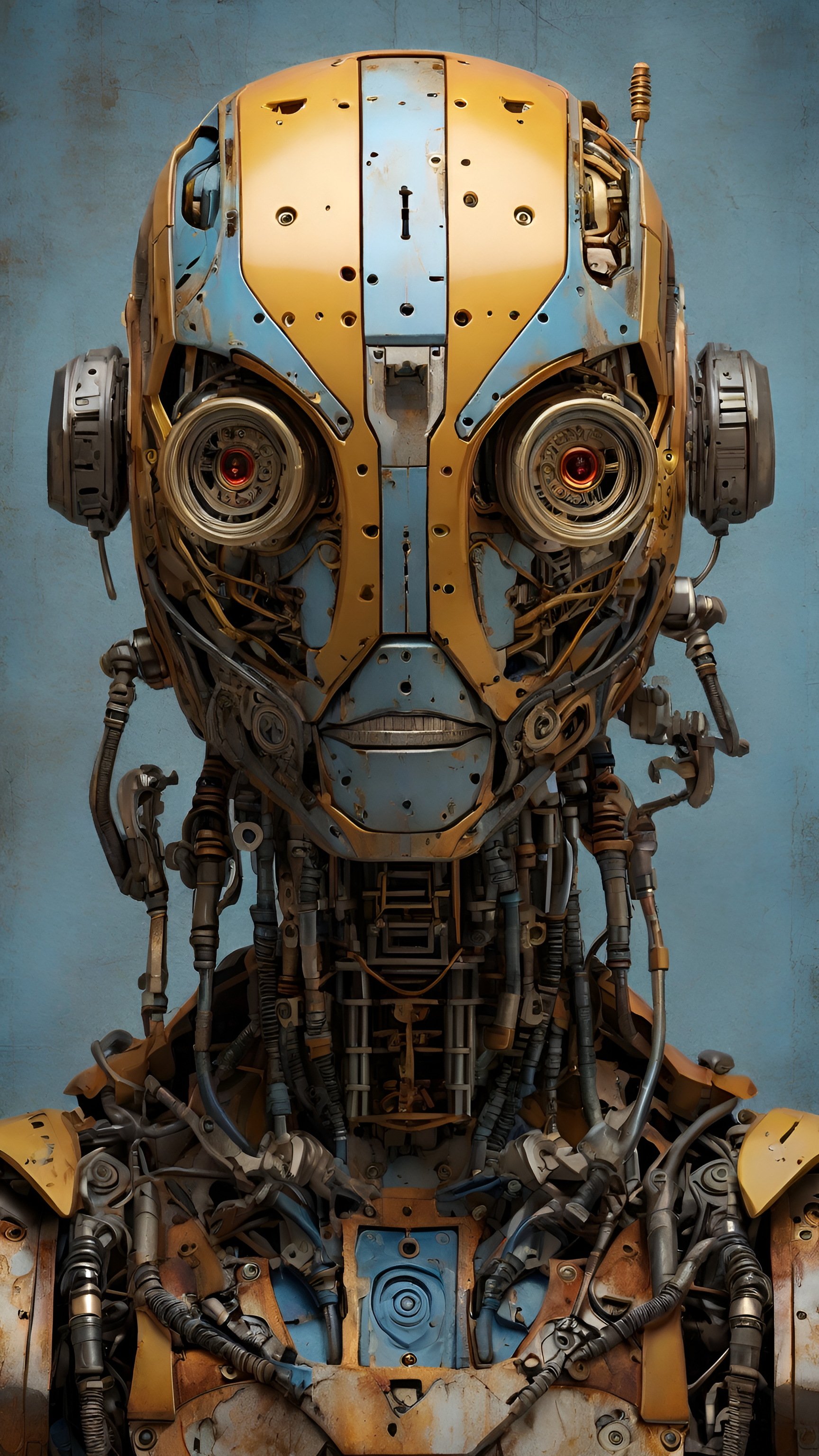 Discover the captivating world of robotics with this stunning wallpaper featuring a detailed portrait of a futuristic robot. The intricate mechanical design showcases a blend of rusty metal and vibrant colors, creating a striking visual that highlights the beauty of technology. With large expressive eyes and a unique faceplate, this robot embodies a sense of personality and innovation. Ideal for tech enthusiasts, this wallpaper serves as a perfect backdrop for personal devices, adding a touch of futuristic charm to your digital space. Embrace the future of art and technology with this eye-catching image.