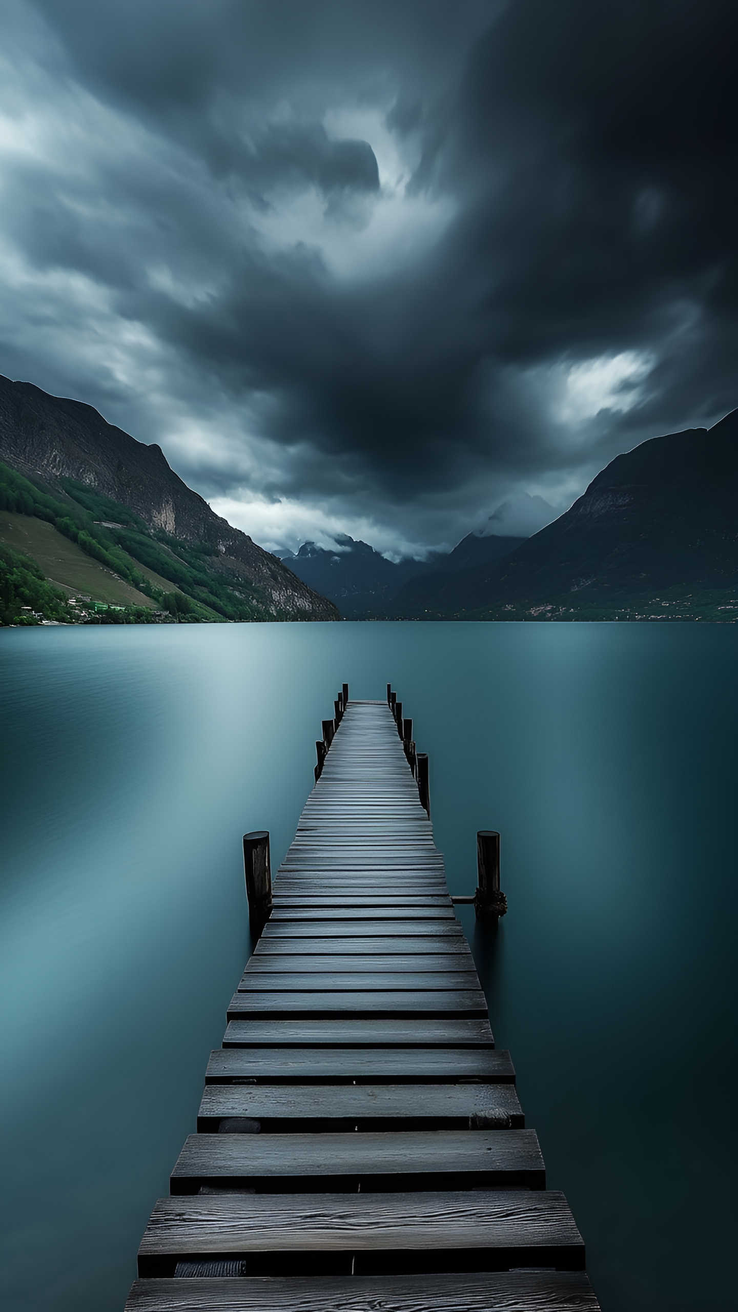 Experience the captivating beauty of nature with this stunning wallpaper featuring a wooden pier extending into a tranquil lake, framed by majestic mountains and a dramatic cloudy sky. The deep blue waters reflect the moody atmosphere, creating a sense of depth and mystery. The contrast between the dark clouds and the serene lake invites contemplation and introspection, making this image perfect for those who appreciate the beauty of solitude and nature's power. Ideal for use on personal devices, this wallpaper adds a touch of calm and sophistication to any digital space.