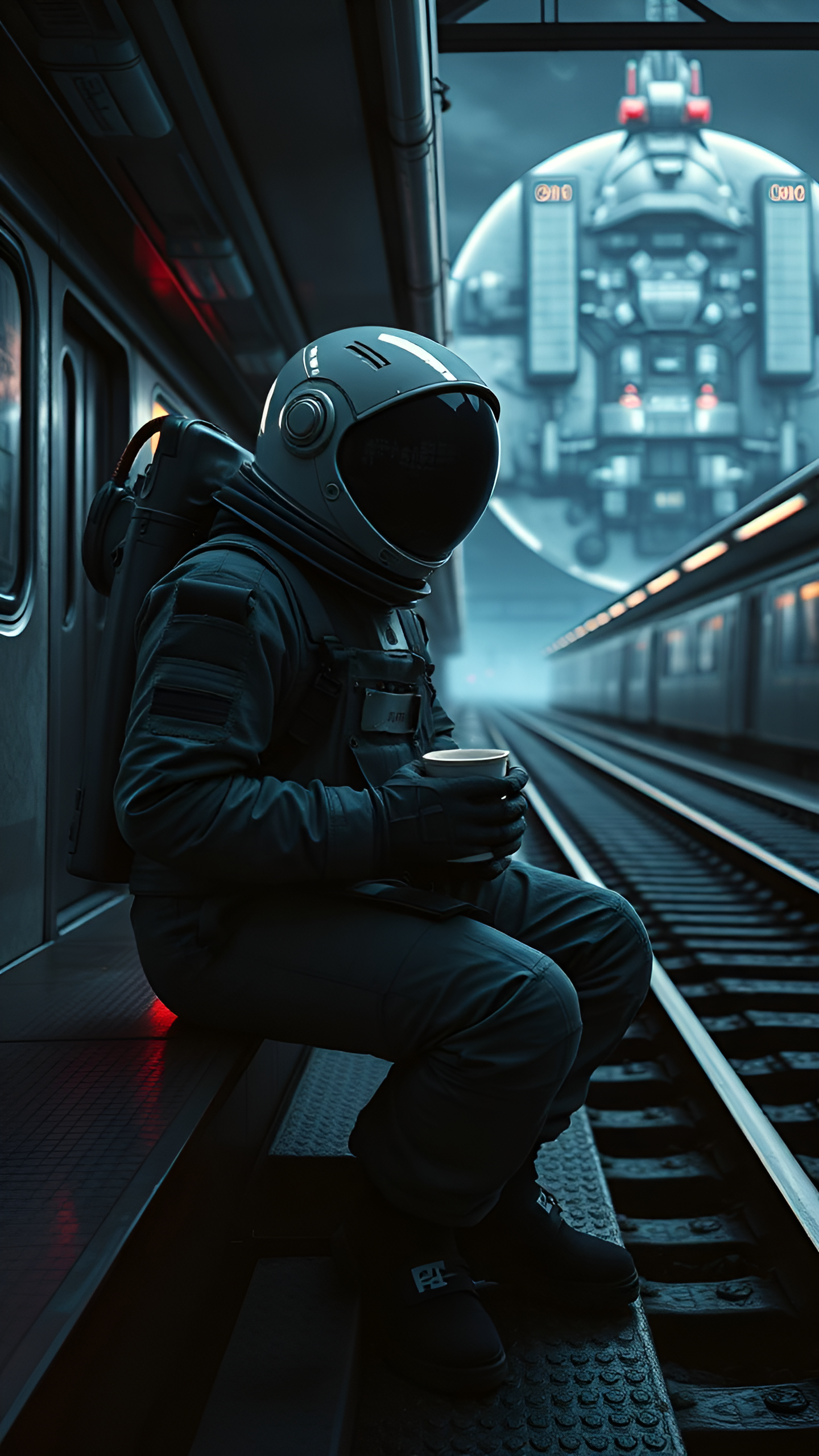 Step into a captivating world where space meets urban life with this striking wallpaper featuring an astronaut seated on a subway platform, holding a warm cup. The scene is set against a backdrop of a futuristic spaceship, illuminated by soft, ambient lighting that enhances the mysterious atmosphere. The astronaut's sleek suit contrasts with the industrial environment, creating a unique blend of technology and everyday life. This wallpaper is perfect for sci-fi enthusiasts and those who appreciate imaginative art, adding a touch of intrigue and adventure to any digital space.