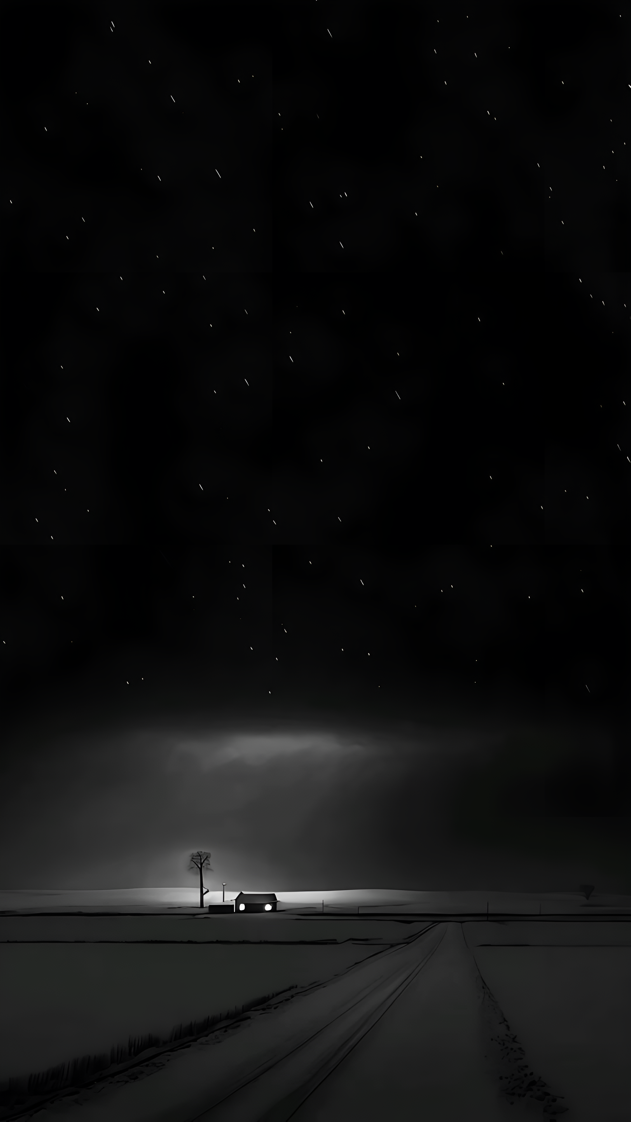 Immerse yourself in the tranquil beauty of this striking wallpaper depicting a lone car parked beside a quaint house under a vast starry sky. The monochromatic palette enhances the serene atmosphere, with the soft glow of the car's headlights illuminating the surroundings. The distant silhouette of a tree and the gentle contours of the landscape evoke a sense of solitude and peacefulness. This wallpaper is perfect for those who appreciate minimalistic art and the calming essence of night, making it an ideal addition to any digital space, whether for relaxation or inspiration.
